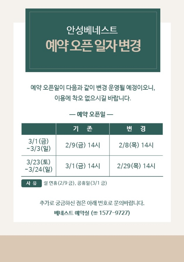 [안성베네스트] 3월 1&4주차 휴일 예약 오픈 일자 변경 안내